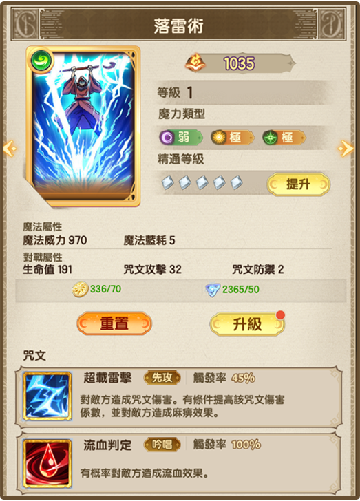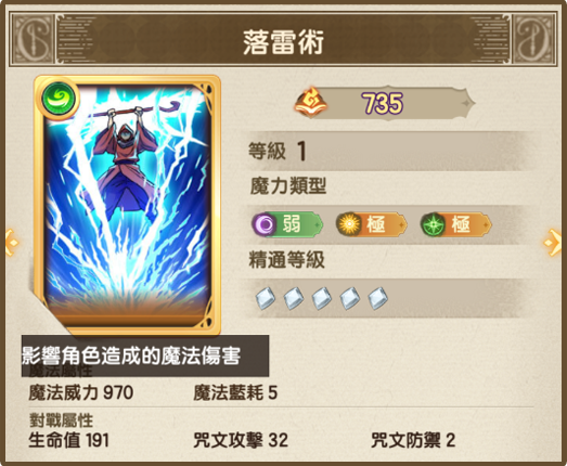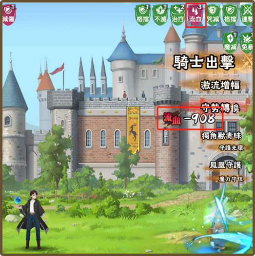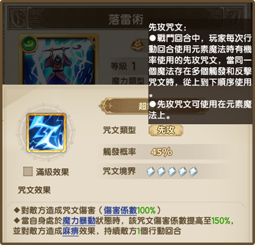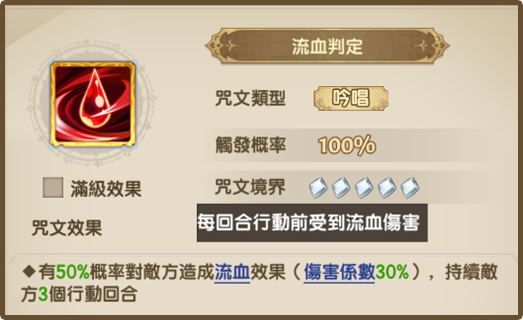 落雷術魔法融合流血判定咒文,除了魔法傷害,還有概率可以在對方行動回合造成3回合的流血傷害,這類傷害則為異常傷害。