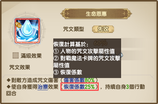 恢復生命值,和角色自身的咒文攻擊屬性相關,以及戰鬥中使用的魔法咒文攻擊相關。(同理回藍恢復係數也是相同的)